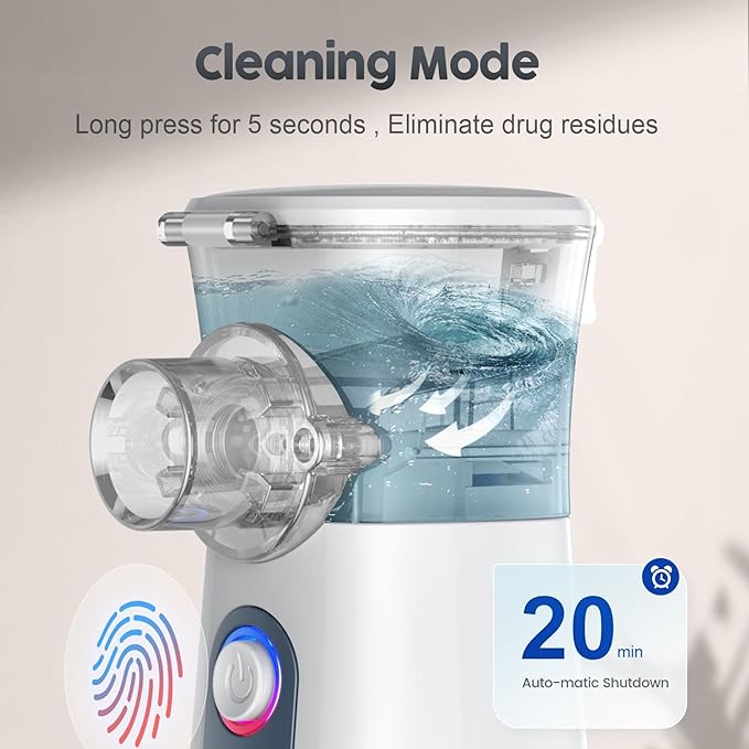 ✅ Inhaler Machine for Adults and Kids - The mesh mist machine has Self-Cleaning Mode. Long press 5s to turn on the self-cleaning mode(all three lights are on), which can be used for daily cleaning to avoid clogging.